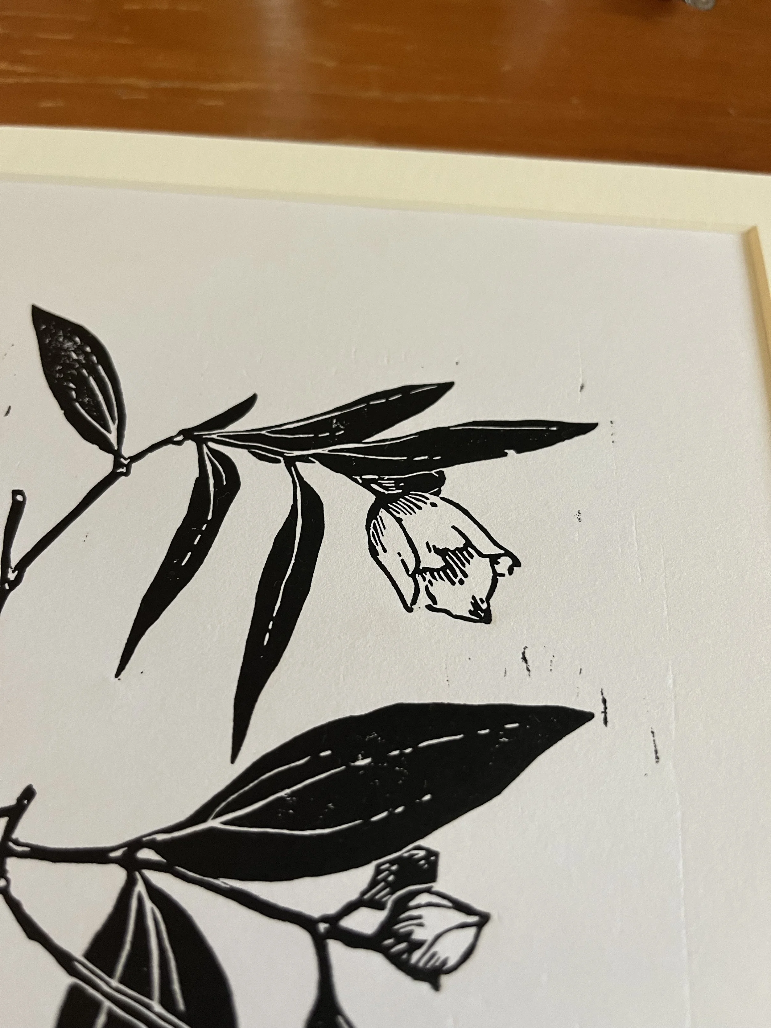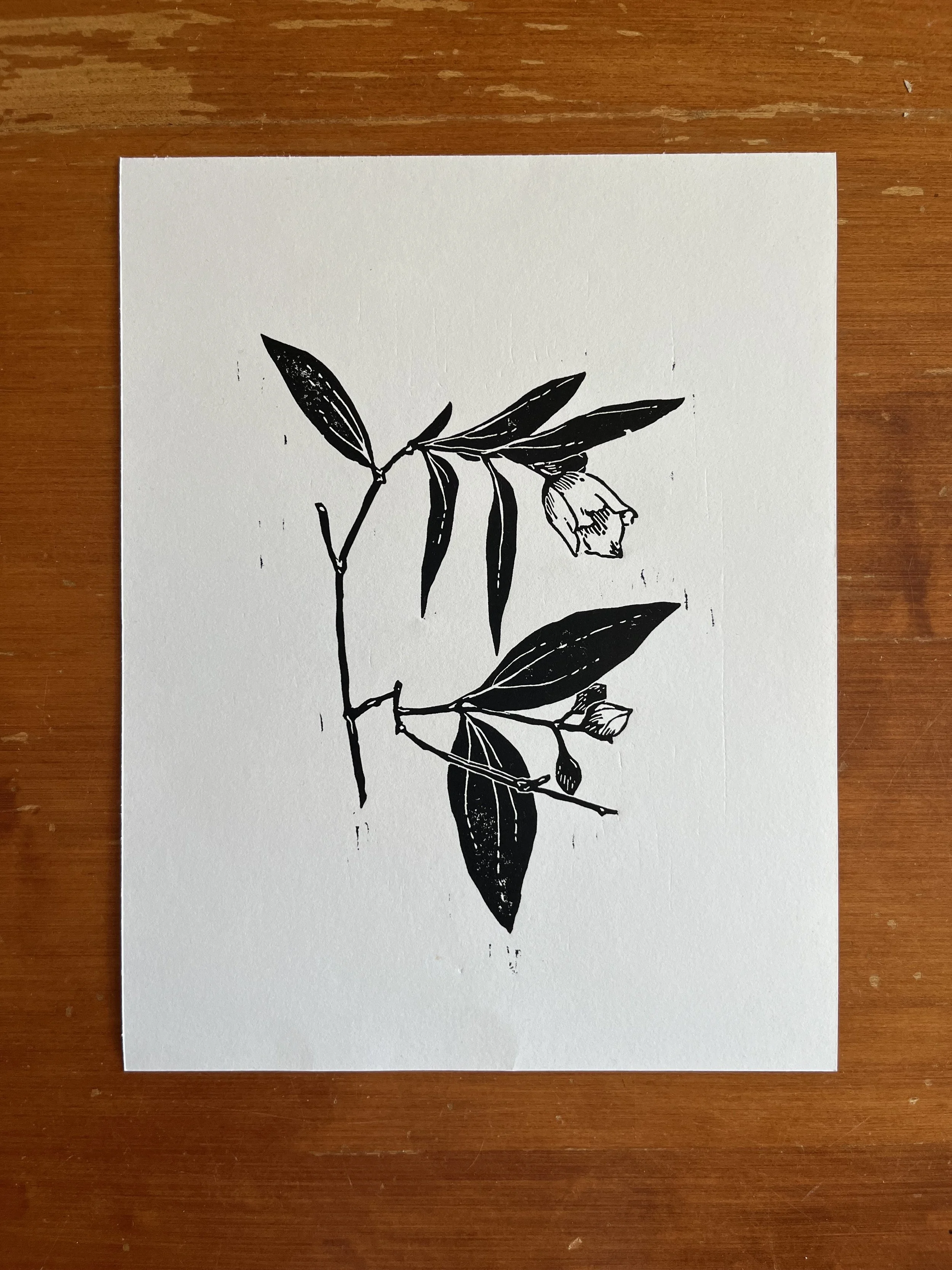 LINO-CUT PRINTBudding Branch is based on a clipping I took from Hampton Park in April of 2019. I still can’t remember what plant it is.